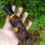 The lid is newly carved from beautifully dark Fenland bog oak from Suffolk which is around 2,300 years old, dating back to the time of the Iron Age. It is beautifully rich and deep in colour, and feels full of positive energies. The lid rests gently in place with a slight friction hold, rather than a tight seal.The box is finished with a Hampshire hazelnut.