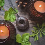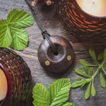 Within the pendant sits our protective herb blend, containing herbs gathered with care from the land surrounding the sacred site of Stonehenge, and sealed in place with a plug of mistletoe.